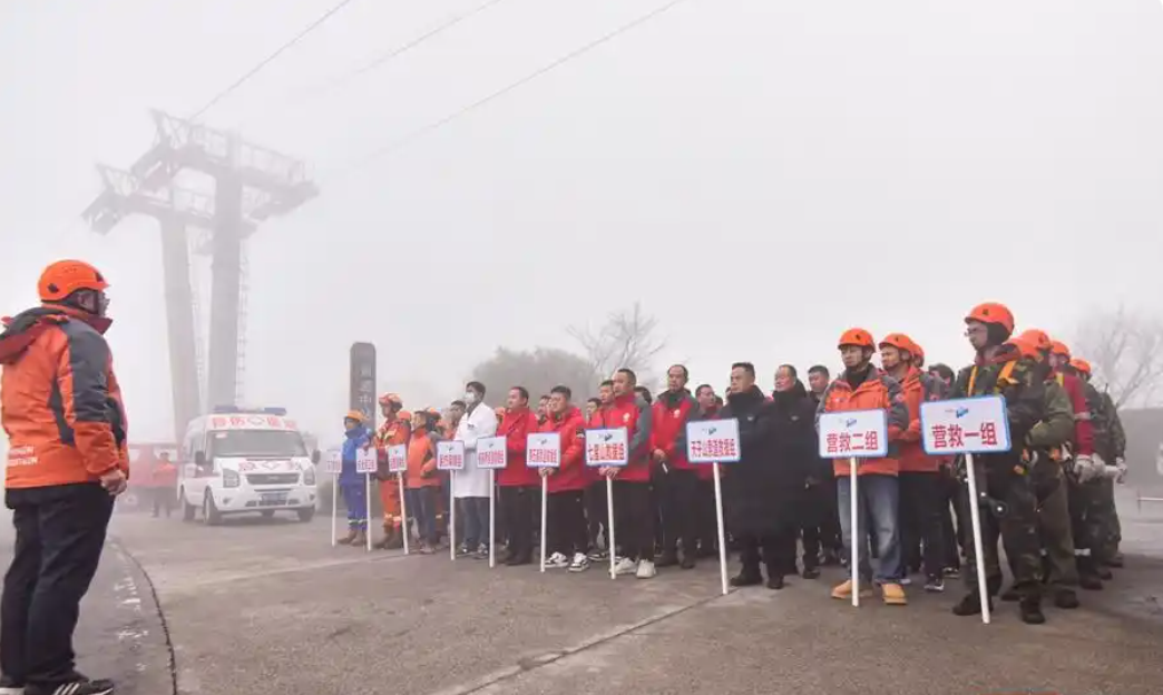 演習正式開始,運行中的天門山索道突然停止,模擬轎廂中的乘客被困。今日山頂飄雪,演習現(xiàn)場大霧彌漫,能見度極低,這為救援行動增添了額外的難度和緊迫感。雖然現(xiàn)場氣溫接近0°,但救援人員已經(jīng)大汗淋漓。