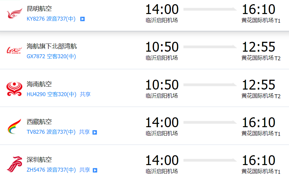 臨沂啟陽機場有直達湖南長沙黃花機場,但沒有直達張家界荷花機場航班,以下是啟陽到黃花參考: