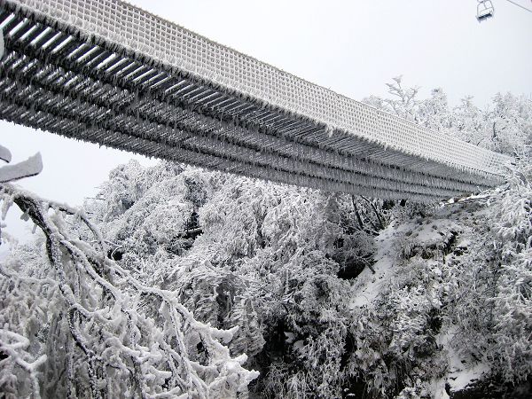 由于淡季,不用排隊(duì)很快坐上了索道,前前后后的轎廂內(nèi)都沒人,俺倆坐著好不優(yōu)哉。索道漸次翻越而后陡然爬升,進(jìn)入乳白色的氤氳之中,最后全被濃厚的霧氣包裹,像在云霧中漂移。俺又爽又驚,心想神仙還真不是好當(dāng)?shù)?。看著前面的操作說明:沒事,這個挺先進(jìn)的,碰到惡劣天氣會自動停止運(yùn)行。話音剛落,它就停了,然后左右左右的晃啊晃啊。俺顫顫地問:怕嗎?他說:嗯……還,還成。俺喃喃地道:靠,俺可不想死呢……終于正襟危坐地熬過了那幾分鐘的晃悠,繼續(xù)上行后,霧氣淡了許多,這才看到索道支架和輪軌竟然都凍上厚厚的冰掛。心肝一顫:不是吧,這是到哪了???!