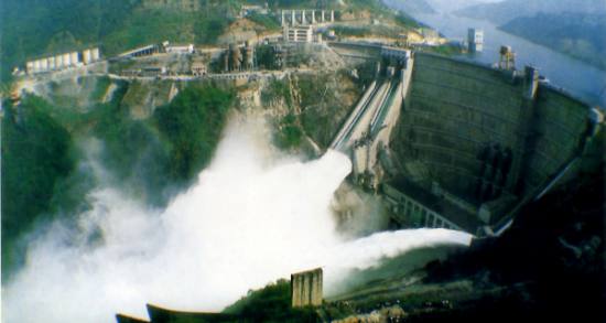 1986年8月2日,東江水電站正式關閘蓄水,雙曲大壩鎖住滾滾東江水,將其定格成碧波萬頃的湘南明珠——東江湖。大壩兩側(cè)有三條滑雪式溢洪道,每當瀉洪時,湖水從溢洪道飛瀉而下,再騰空躍起,頃刻間化成雨霧,迷漫整個峽谷,其勢如萬馬奔騰,其聲似萬鈞雷霆。身歷其境,如夢如幻,仿佛在縹緲之中,羽化飛升。即使在幾里開外,仍感水星拂面,頗具“盤空舞雪飛泉落,撲面銀花細雨來”的詩畫意境。